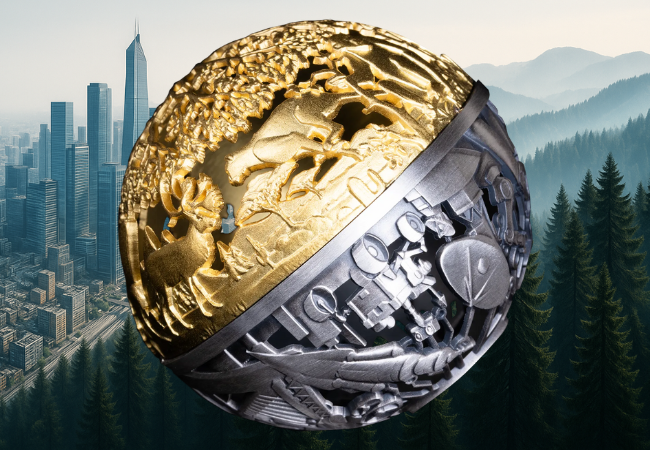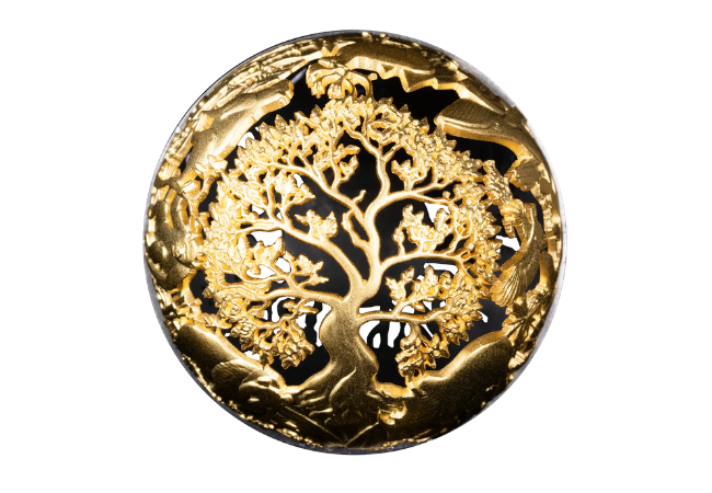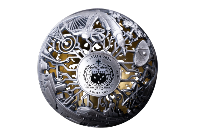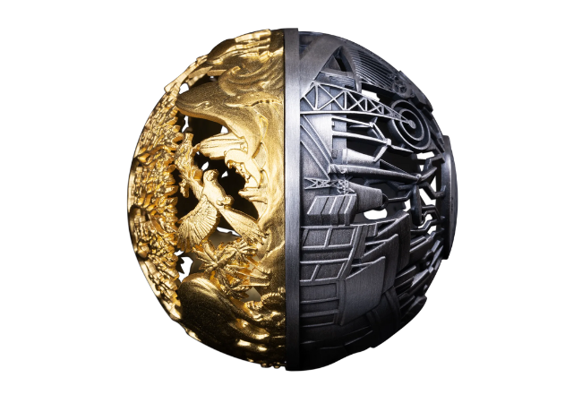 A coin of two worlds – the natural world and the technological world are brought together in stunning spherical form
